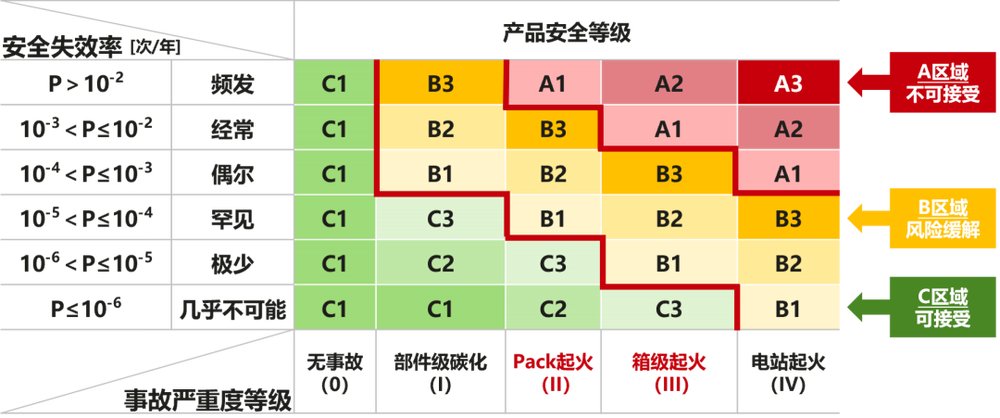 華為數(shù)字能源聯(lián)合提出的評(píng)估體系將儲(chǔ)能系統(tǒng)安全風(fēng)險(xiǎn)由高至低分為A(不可接受)、B(風(fēng)險(xiǎn)緩解)、C(可接受)三個(gè)等級(jí),并明確了各等級(jí)對(duì)應(yīng)的失效概率要求。其中,A級(jí)風(fēng)險(xiǎn)極高,系統(tǒng)安全風(fēng)險(xiǎn)完全不可控,重大安全事故概率極高;B級(jí)風(fēng)險(xiǎn)較高,必須通過持續(xù)優(yōu)化產(chǎn)品設(shè)計(jì)與引入創(chuàng)新技術(shù)以降低風(fēng)險(xiǎn);C級(jí)為安全風(fēng)險(xiǎn)總體可控,可有效避免整站火災(zāi)等嚴(yán)重后果。