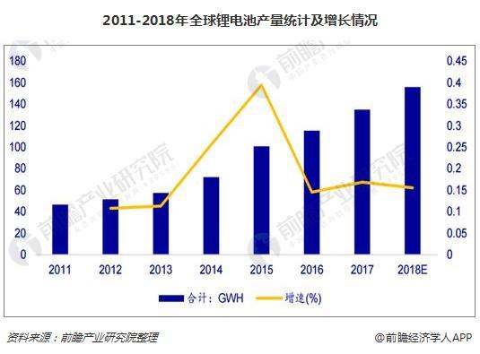 2011年以來,由于能源技術(shù)變革以及新興科技的帶動下,全球鋰離子電池產(chǎn)量進入飛速增長期,2012年到2015年增速均超過50%。2015年全球鋰電池產(chǎn)量100.75GWh,同比增長39.45%;2017年,鋰離子電池主要應用市場增速放緩,增速只有16.85%,但受益于新能源汽車行業(yè)景氣帶動的動力電池繁榮,預計2018年全球鋰電池增速維穩(wěn),產(chǎn)量有望達到155.82GWH,市場規(guī)模將到達2313.26億元。