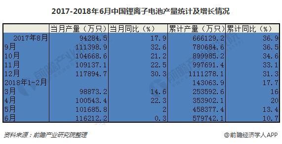 據(jù)前瞻產(chǎn)業(yè)研究院發(fā)布的《鋰電池行業(yè)市場需求預測與投資戰(zhàn)略規(guī)劃分析報告》統(tǒng)計數(shù)據(jù)顯示,2018年6月,中國鋰離子電池產(chǎn)量為116212.2萬只,同比微增0.3%。2018年1-6月,全國鋰離子電池累計產(chǎn)量達579742.1萬只,同比增長10.7%。