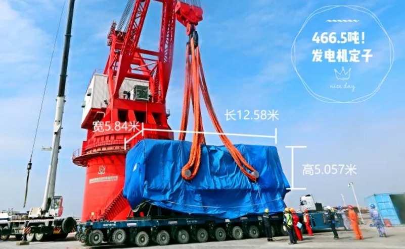 福清5號機組發(fā)電機凈重455噸,吊裝重量466.5噸,是整個現(xiàn)場單鉤吊裝重量最大的設備。