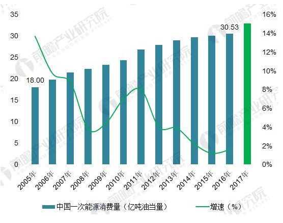 圖表4:2005-2017年全球一次能源消費總量及增速(單位:億噸油當量,%)