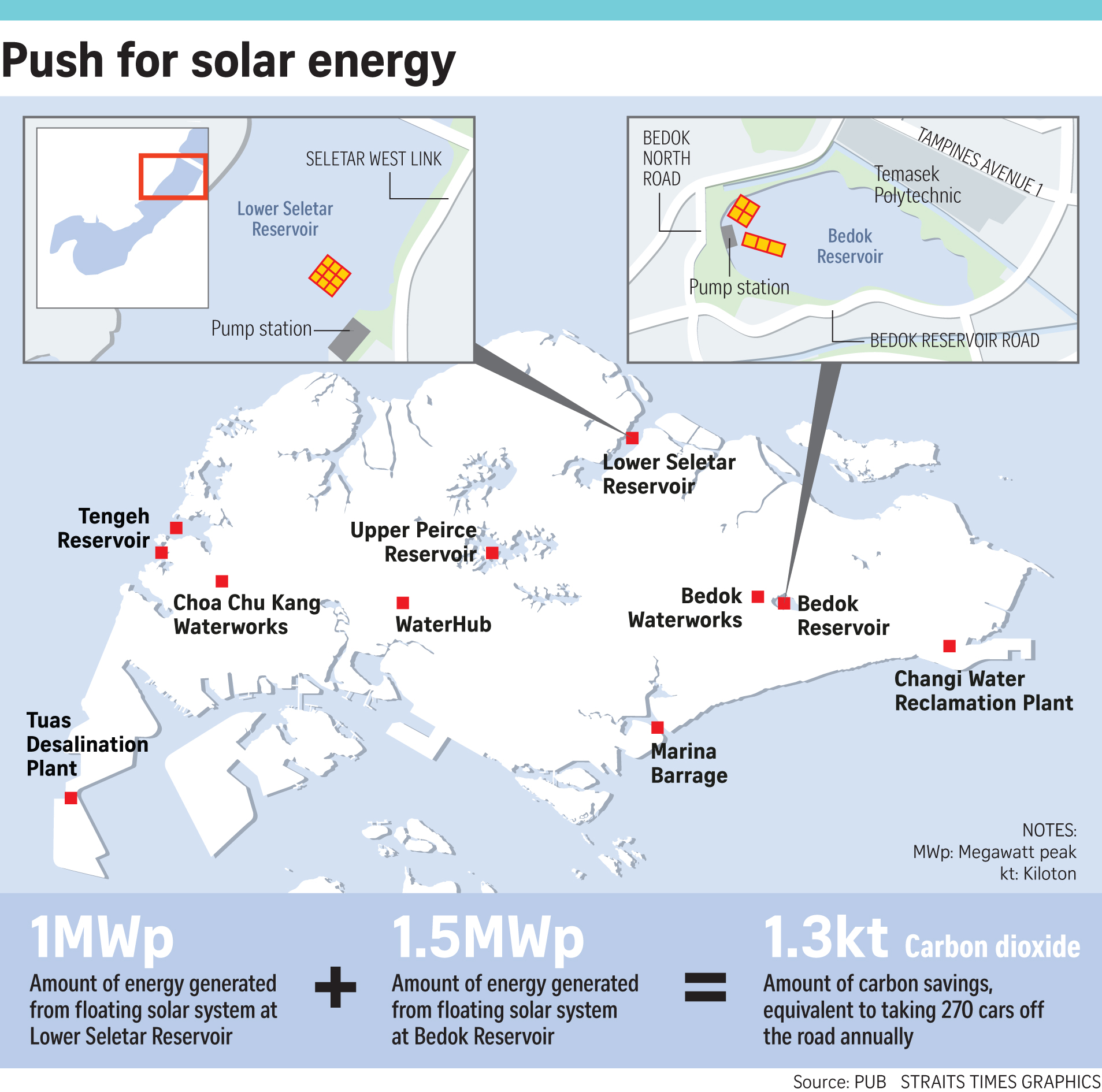 在兩個(gè)水庫(kù)建立太陽(yáng)能系統(tǒng)每年將減少PUB的碳足跡,估計(jì)每年排放約1.3千噸二氧化碳,相當(dāng)于每年在道路上行駛大約270輛汽車。